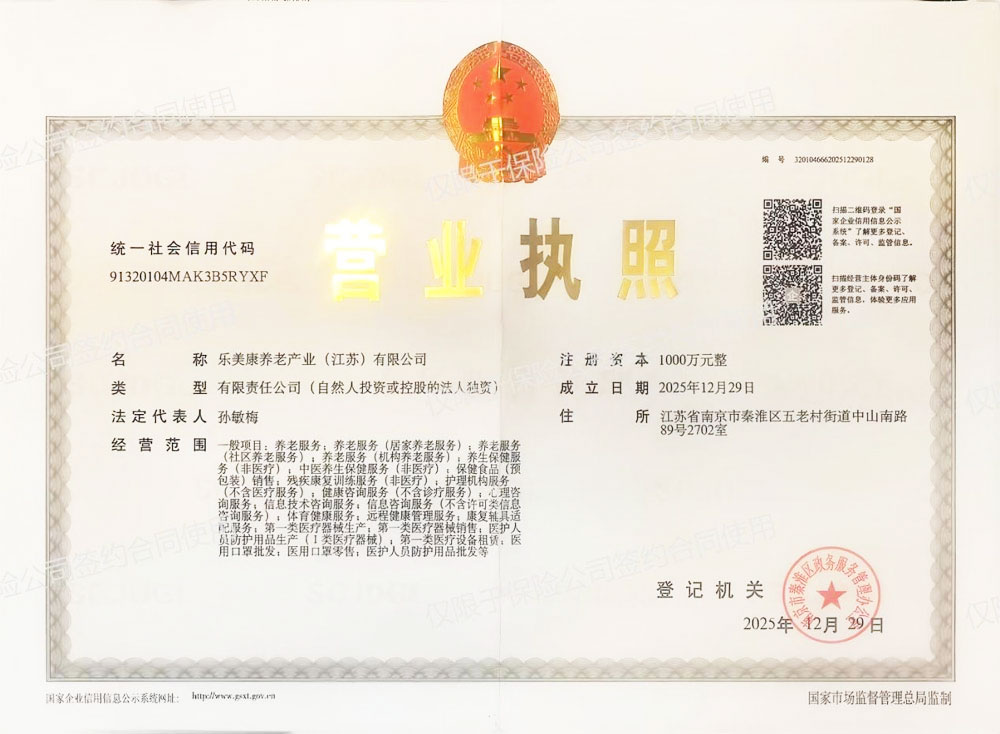 乐美康养老产业(江苏)有限公司,是一家专注于养老健康服务的有限责任公司,注册资本为1000万元人民币,注册地址位于江苏省南京市秦淮区中山南路89号27楼A座。