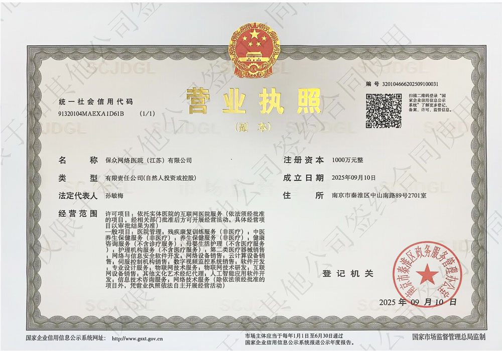 保众网络医院(江苏)有限公司是敏梅集团旗下专注于“互联网+医疗健康”服务的创新型科技企业,成立于2025年,总部位于南京秦淮区中山南路核心商务区。公司依托实体医院资源,以科技赋能医疗,致力于构建安全、便捷、专业的线上线下一体化医疗健康服务平台。