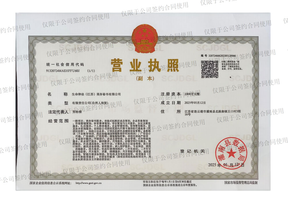 生命律动(江苏)商务秘书有限公司是敏梅集团旗下,专注于为新时代创新型企业提供智能化、体系化后台运营支持与商务赋能解决方案的专业机构。我们深刻理解在高速发展的商业环境中,灵活、合规、高效的运营体系是企业保持生命力与竞争力的关键。公司以“让运营有章法,让发展有节奏”为使命,致力于将繁琐的行政、法务、商务流程转化为清晰、流畅、可靠的标准化服务,成为客户业务稳健增长的“节拍器”与“加速器”。