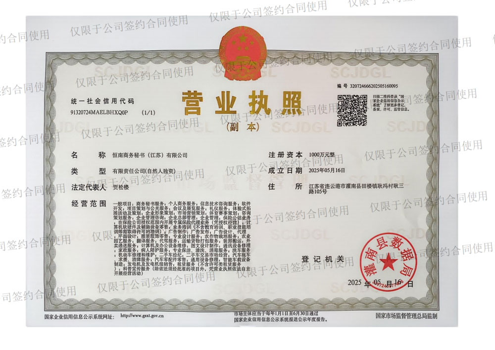 恒南商务秘书(江苏)有限公司是敏梅集团旗下专注于为企业提供全方位、标准化后台运营支持与商务解决方案的专业服务机构。我们深刻理解企业在快速发展中对效率、合规与成本的核心关切,致力于将繁琐的行政、工商、法律事务转化为清晰、可靠、高效的服务流程,让企业主与管理层能够更专注于核心战略与业务成长,成为值得信赖的“外部战略后勤部”。