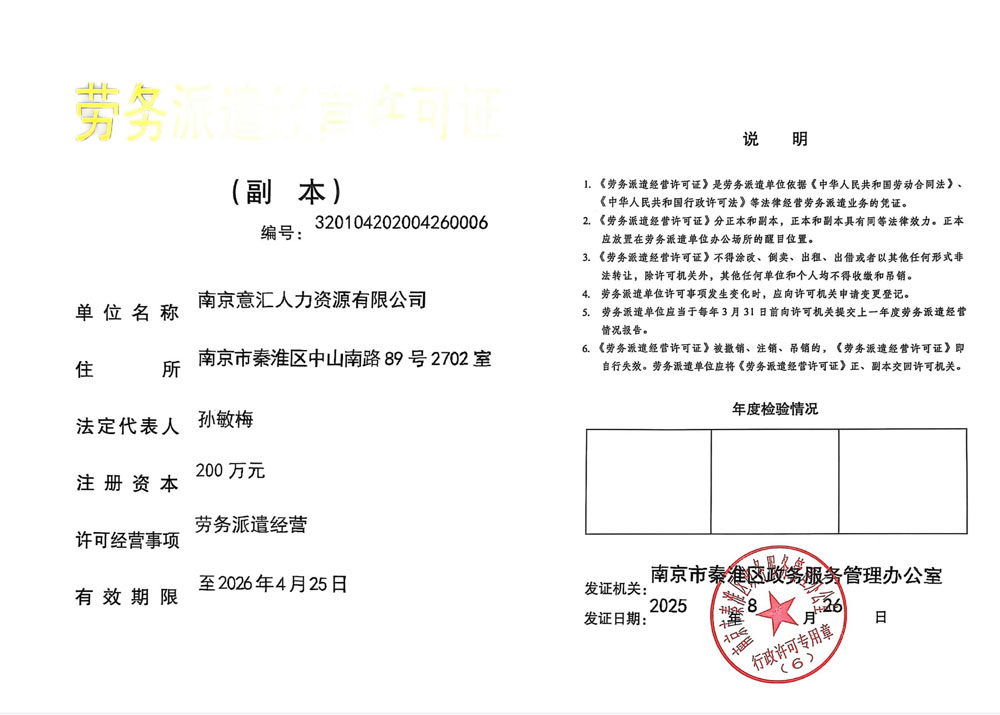 南京意汇人力资源有限公司(简称“意汇人力”)是敏梅集团旗下专注于人力资源综合解决方案的专业服务机构。公司成立于2020年,扎根于集团总部所在地南京,致力于成为连接优秀人才与卓越组织的战略桥梁。我们以“汇聚英才,赋能组织”为使命,深刻理解人才在企业发展中的核心价值,通过专业化、精细化的人力资源服务,为各类组织的稳健发展与转型升级提供坚实的人才供应链支撑。