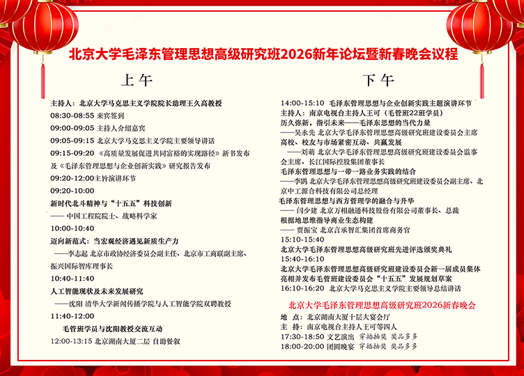 2026年1月,北京大学毛泽东管理思想高级研究班2026新年论坛暨新春晚会在北京湖南大厦成功举办。本次论坛以“毛泽东管理思想与新质生产力”为核心议题,汇聚了来自学界、政界、企业界的多位专家与实践者。敏梅企业管理集团创始人孙敏梅女士作为特邀嘉宾出席,参与高端对话,汲取前沿思想,并就历史管理智慧与当代企业创新的融合路径进行了深入交流与思考。